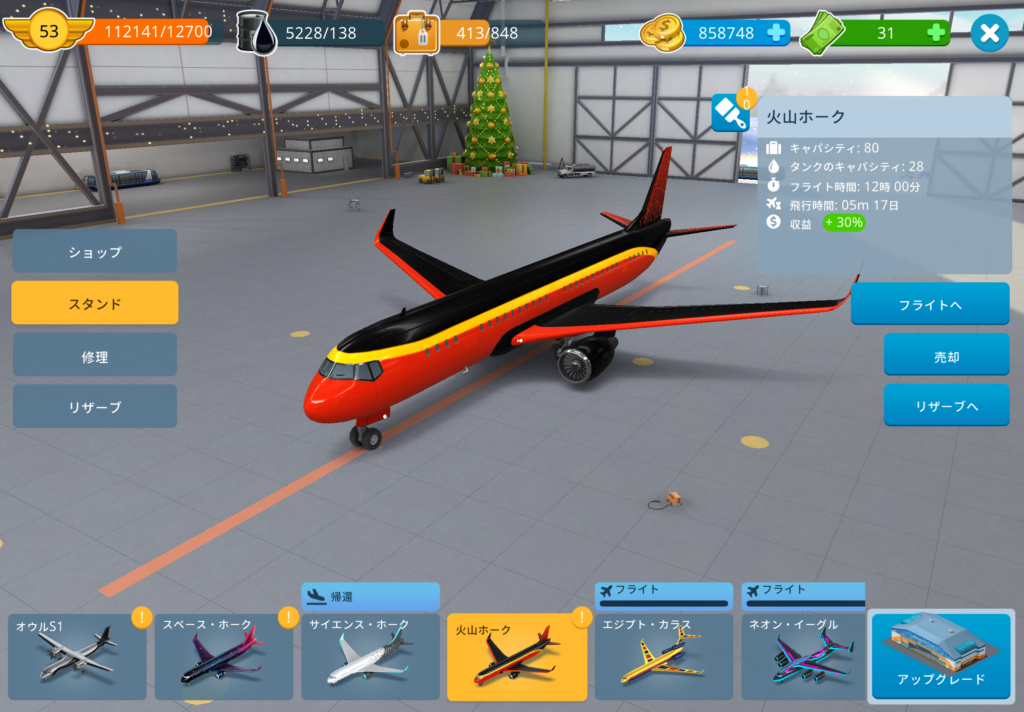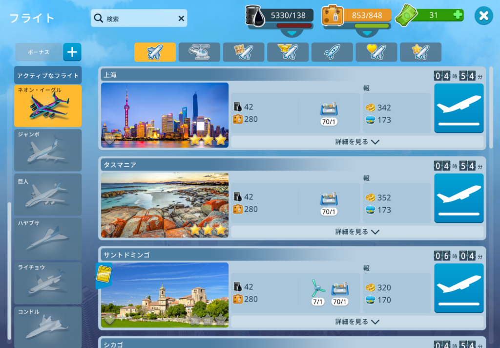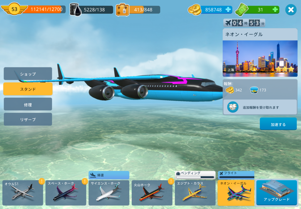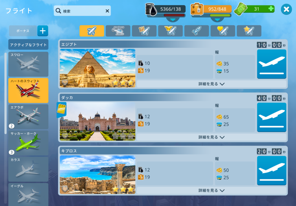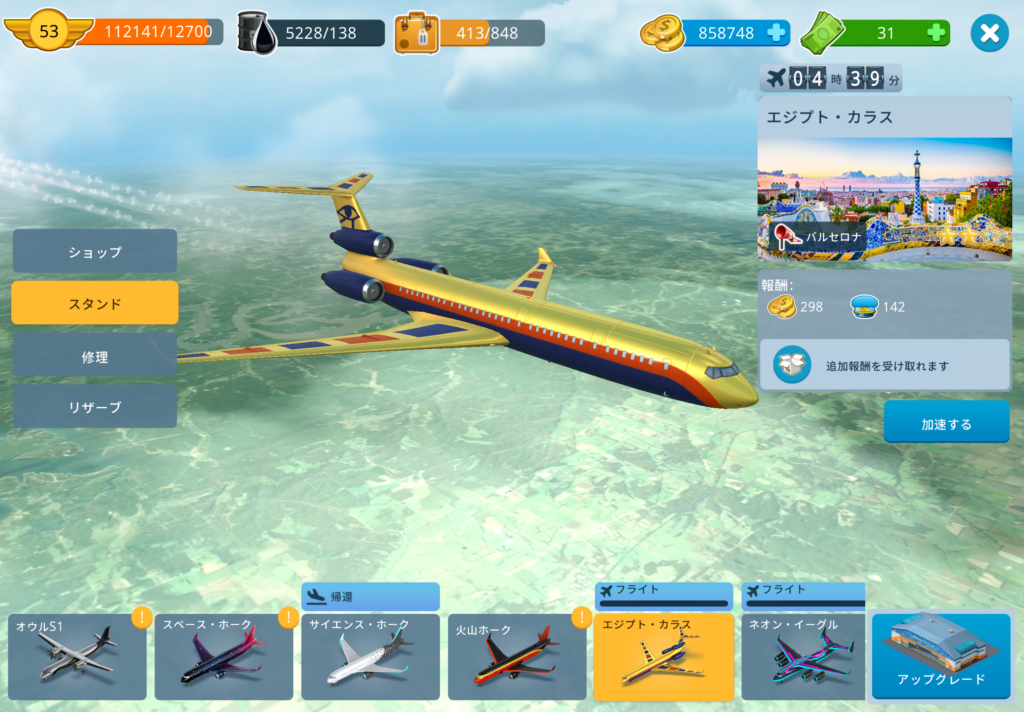 各都市によって、必要な燃料や乗客数、そして得られる報酬(コインや経験値)が異なります。 最初は小型機からスタートしますが、ゲームを進めて機体をアップグレードしていけば、より遠くの都市へ、より多くの乗客を運べる大型機を導入できるようになります。