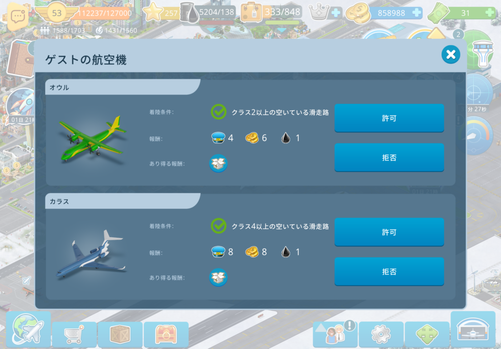 滑走路に降りてきたゲスト機(オウルやカラスなど)を誘導し、着陸を許可することで、報酬としてコインや燃料、そして建築に必要な経験値を獲得できます。自分のフライトの合間にゲスト機をテキパキとさばくのが、レベルアップへの近道です。