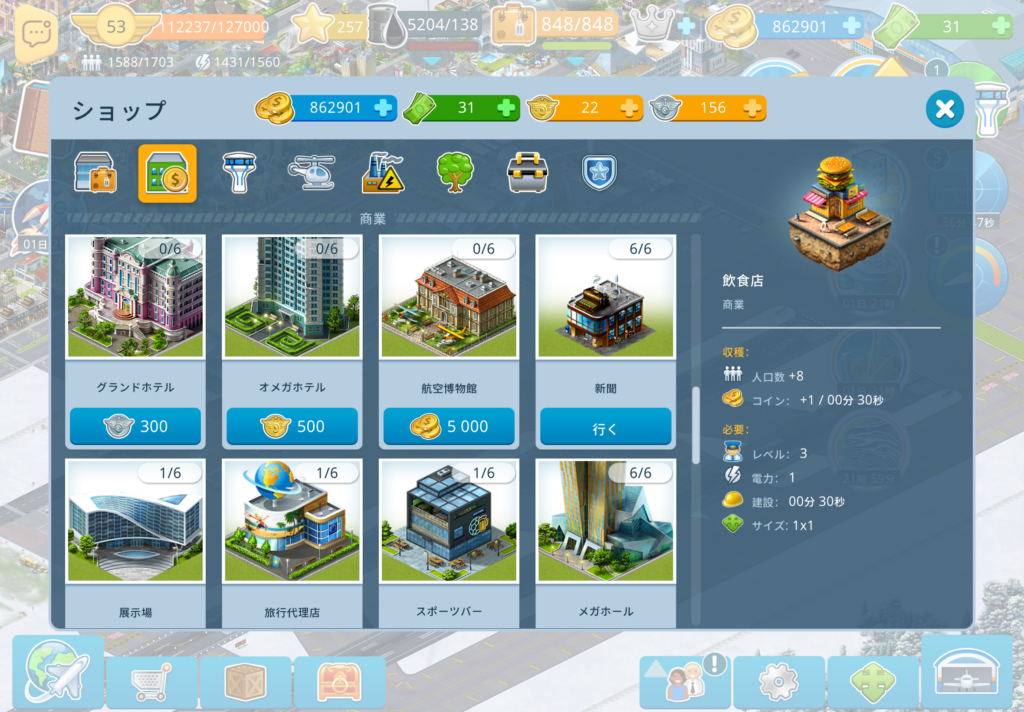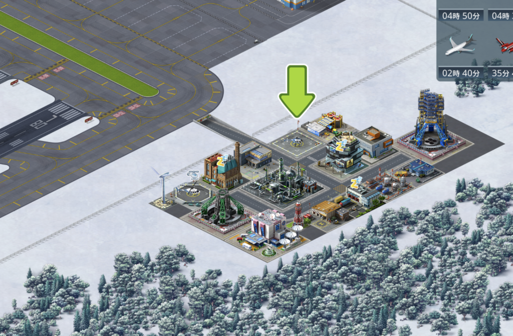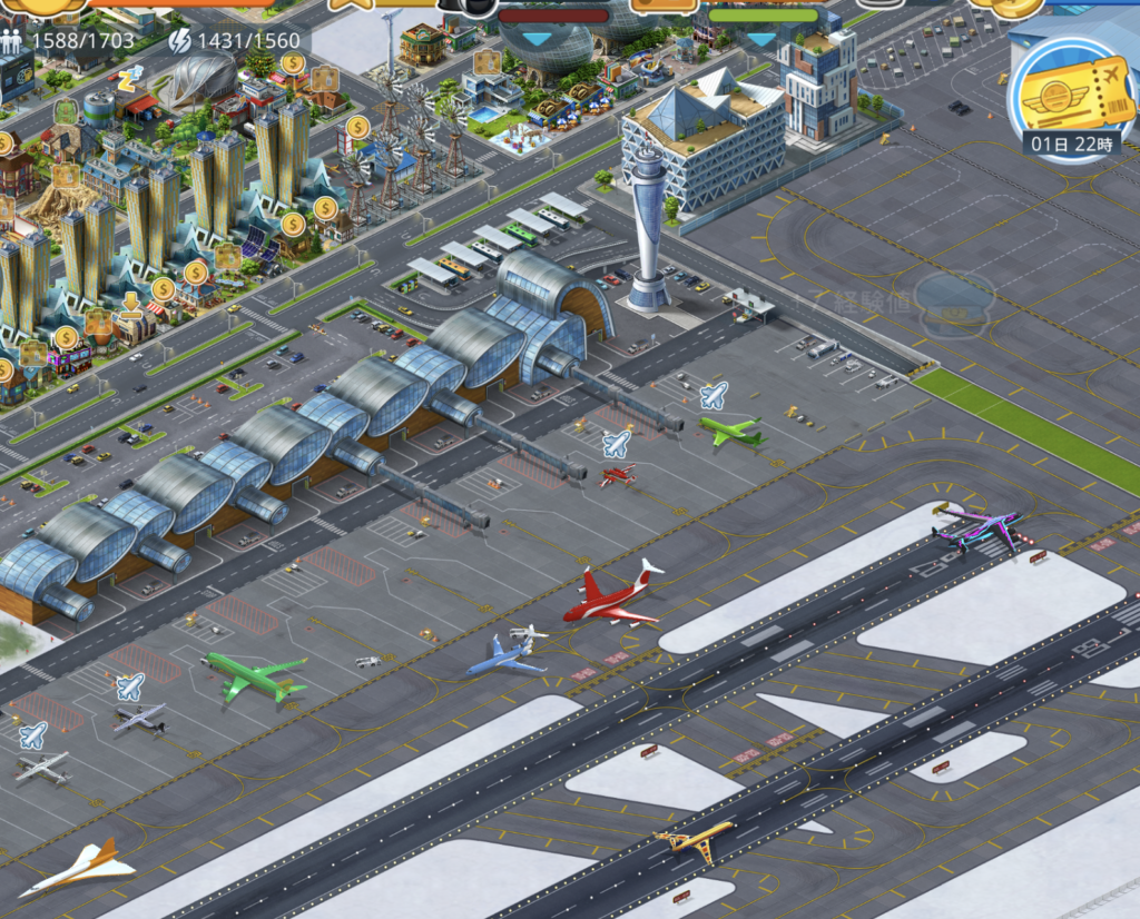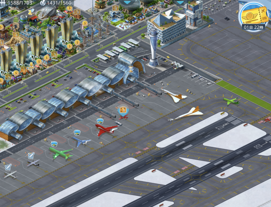 - 商業エリア: 「飲食店」や「航空博物館」などは、定期的に「コイン(お金)」を回収できます。