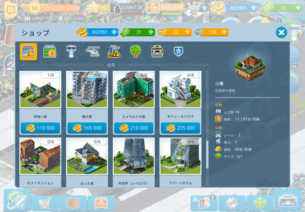街づくりも非常に戦略的です。ショップで購入できる建物には、大きく分けて2つの役割があります。