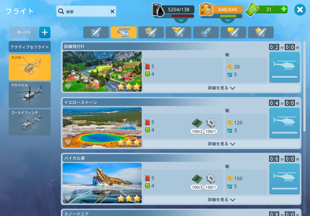 - ヘリコプター: 飛行機とはまた違ったルートで世界中を飛び回ることができます。現在は「スパロー」など数種類ですが、バイカル湖やイエローストーンなど、絶景ポイントへのフライトが可能です。