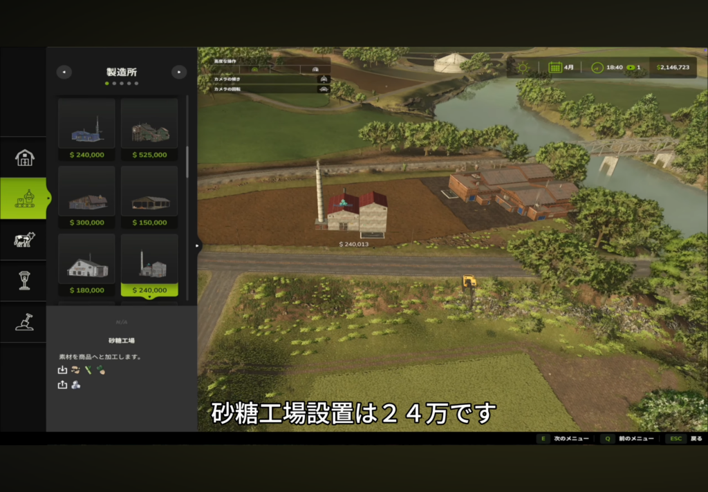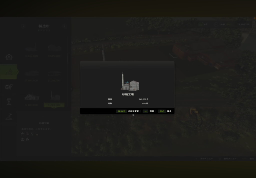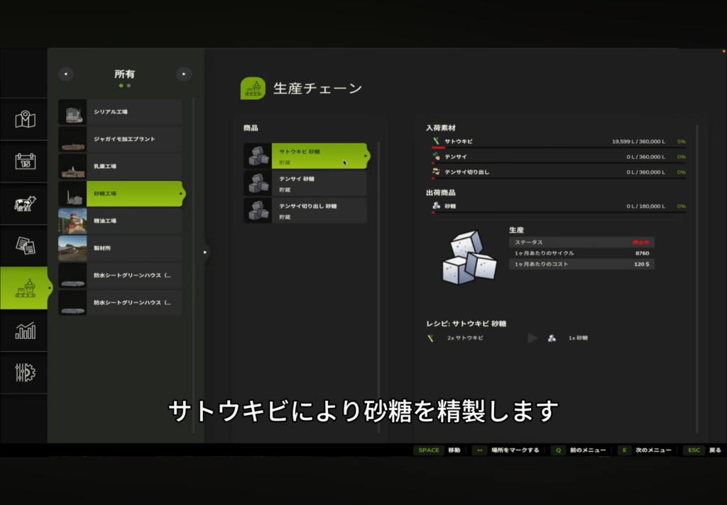 • 製造所メニューから砂糖工場を選択