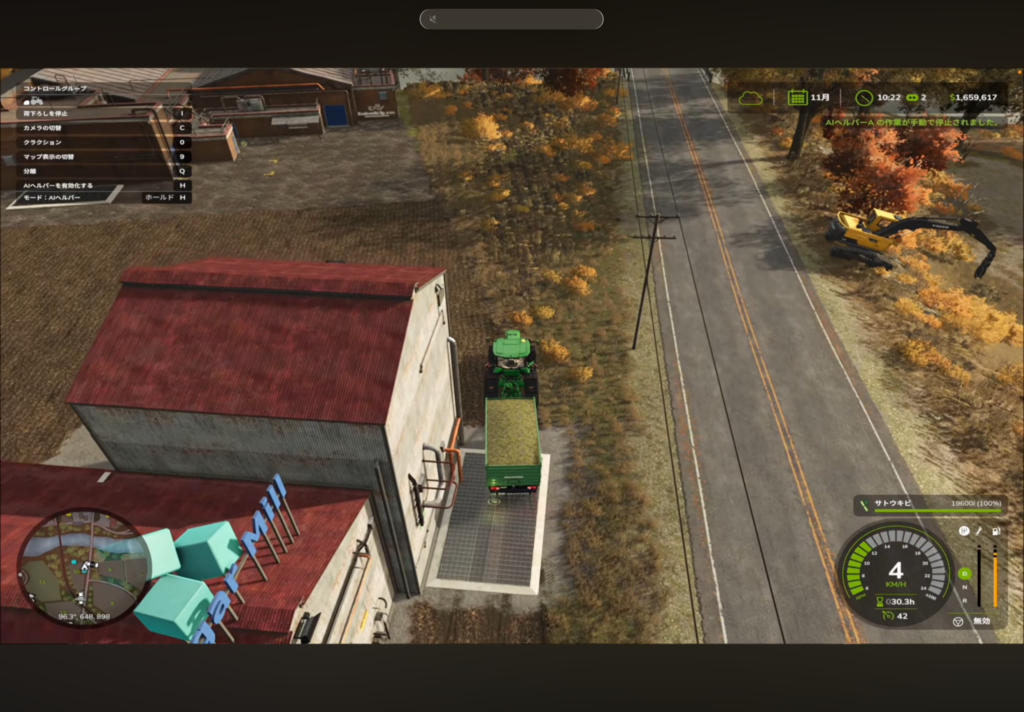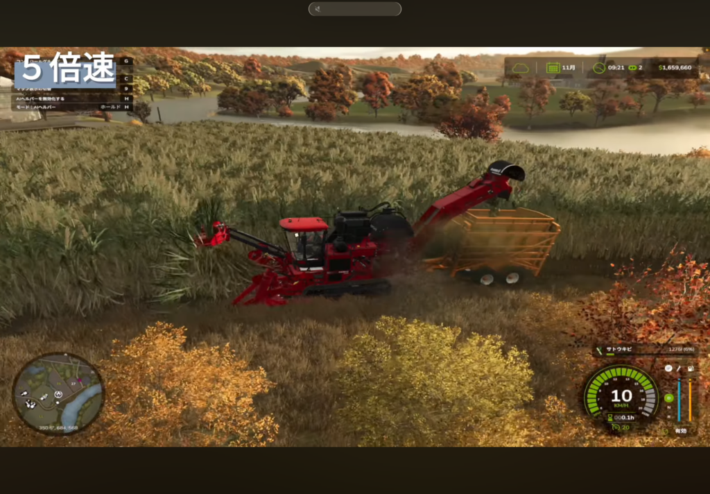 自走式ハーベスターは排出パイプから連続的にサトウキビが出ます。「プレイヤーがトラクターで並走」するか「AIヘルパーをうまく活用」して、こぼさないように受け止めましょう。