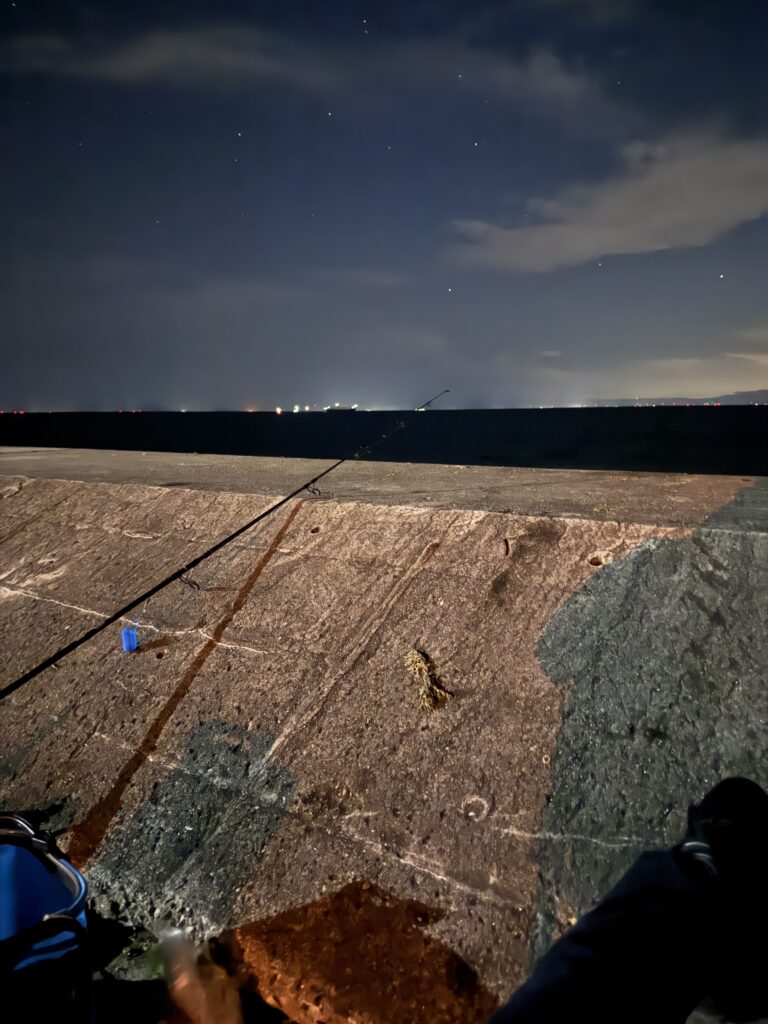 午前3時あたりに着いたが、結構な数の人がいたので、割と釣れるのかなあと思った。周りの人が何目当てで来ているのかが全くわからなかったので、とりあえず一通りの装備をして散策。ほとんどの人は潮止まり中なのか特に釣りを開始している感じはしなかった。かつこの時10メートルほどの強風だったため、割とキャスティングもできない状態。
