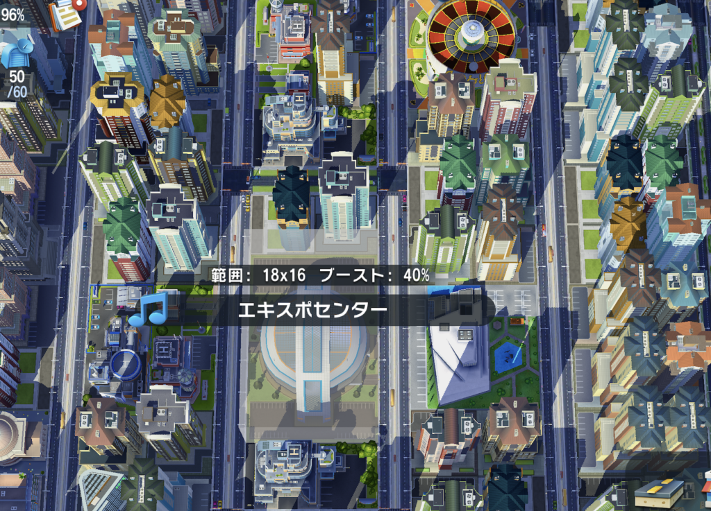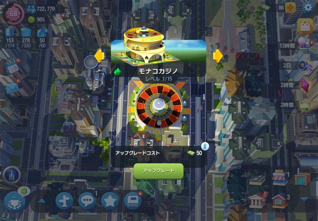 エキスポセンターやモナコカジノといった施設を配置し、ブーストをかけることで、インフラ不足による不満を多少なりとも抑えようとしています。カジノなどはアップグレードにキャッシュ(緑のお金)が必要になる場合もあり、とにかくリソースの管理がシビアになりました。