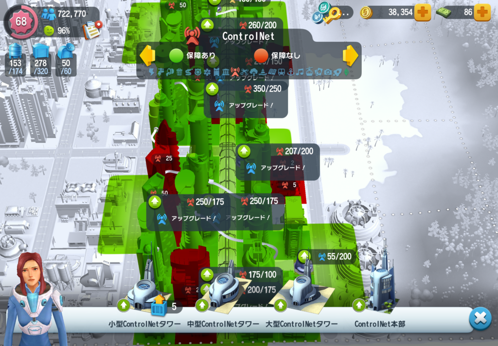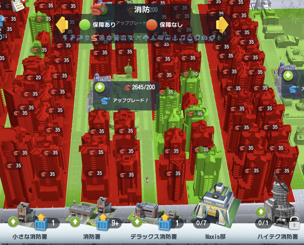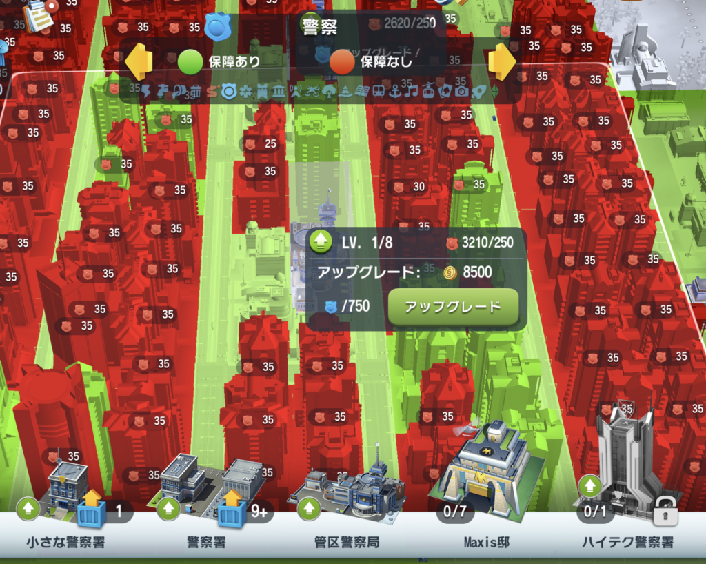 「保障なし」の状態が続くと市民の満足度が下がり、最終的には建物が放棄されてしまいます。既存の建物の配置は、以前の仕様に最適化されていたため、今の狭い保障範囲では全くカバーしきれません。建物の配置自体を根本から変えるか、膨大なお金をかけて施設をすべてレベル上げするかの二択を迫られています。