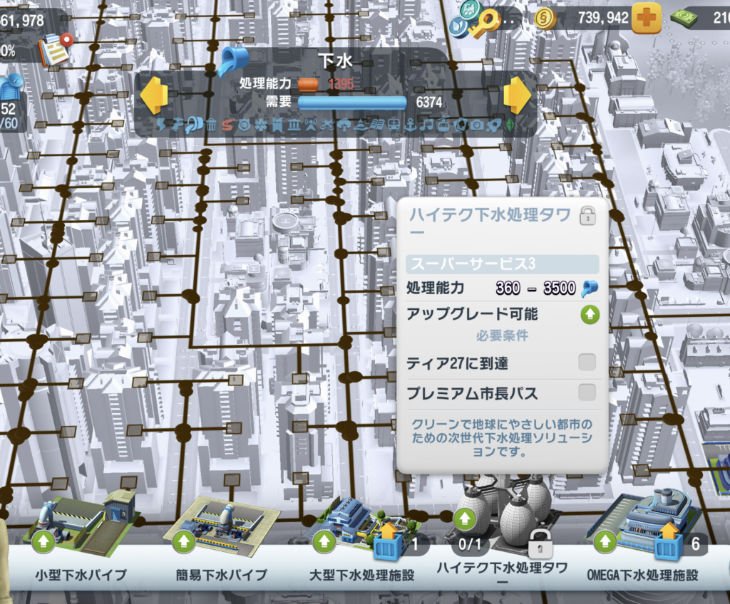 例えば下水処理ですが、画像を見ると処理能力が「1395」に対して需要が「6374」と、圧倒的に足りていません。ハイテク下水処理タワーのような上位施設であっても、レベルを上げない限り以前のようなパフォーマンスを発揮できなくなっています。