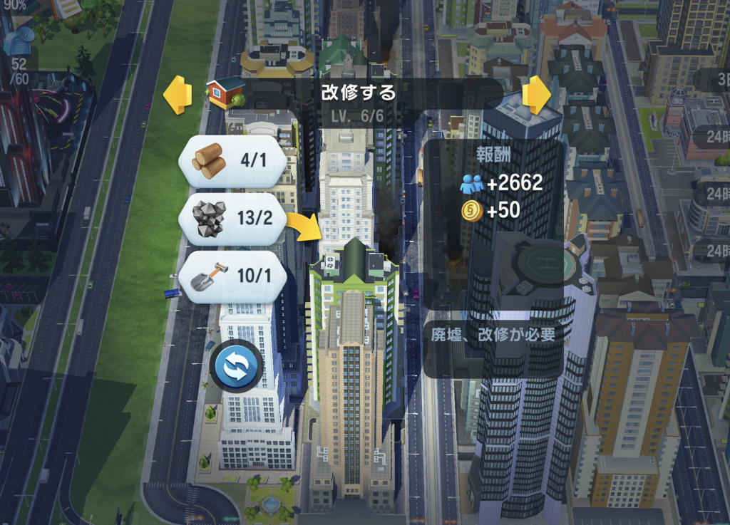 黒い煙が上がり、アイコンが出ている建物がいくつもあります。これらを復旧させるには、単にインフラを整えるだけでなく「改修」が必要です。