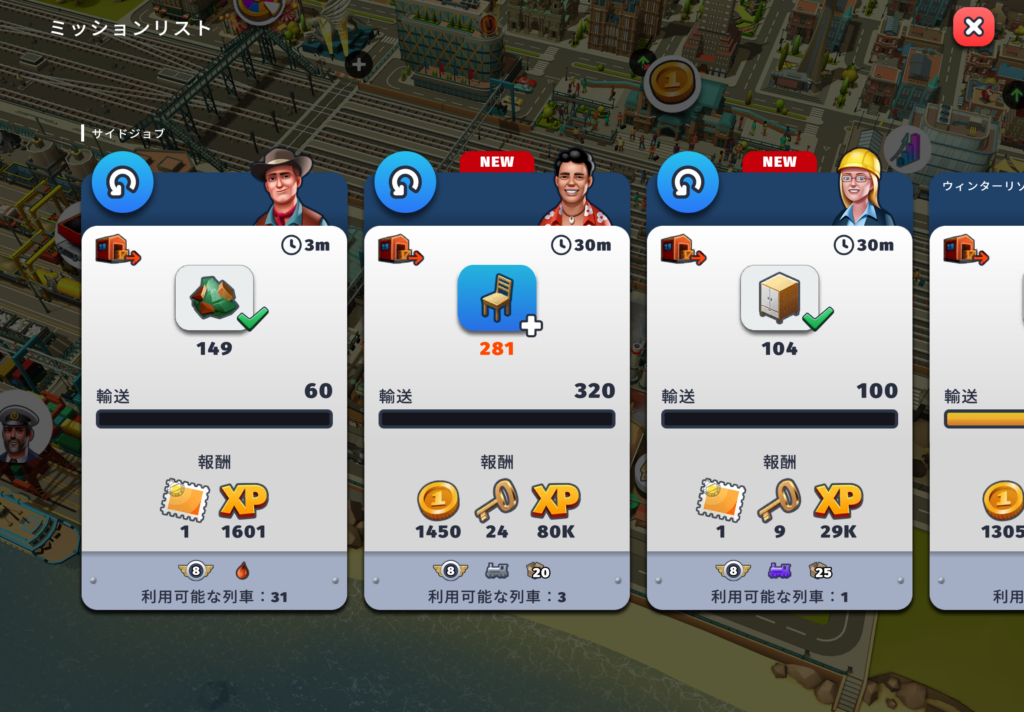 画像にもある通り、ミッションごとに必要な輸送物、数量、所要時間、報酬が明確に表示されているため、現在の手持ち列車やプレイ時間に合わせて選択しやすくなっています。