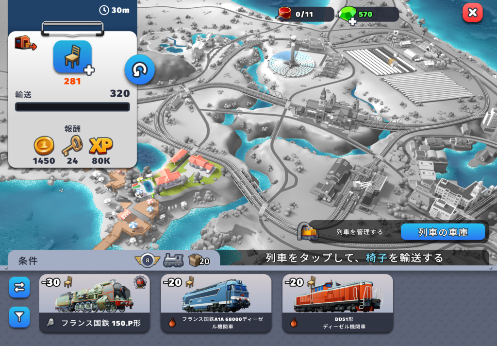 例えば、320個の椅子を輸送するミッションであれば、複数の列車を組み合わせて条件を満たすことになります。どの列車を使うか、どの列車を温存するかといった判断が、効率的な進行に直結します。