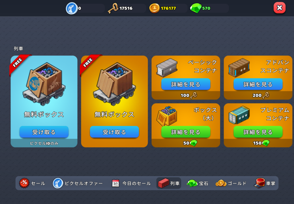 一定時間ごとに受け取れる無料ボックスでは、ランダムで列車やアップグレード素材を獲得できます。無課金プレイヤーにとっては、毎日欠かさず回収しておきたい要素です。