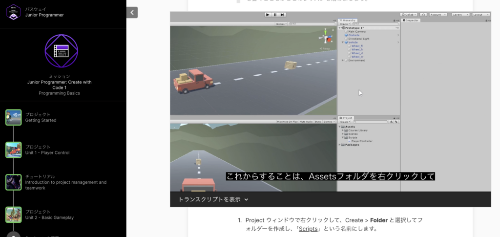 現在は「Junior Programmer」パスのレッスン1から、レッスン3の途中まで進めています。各ユニットでの学びを深掘りしてみます。