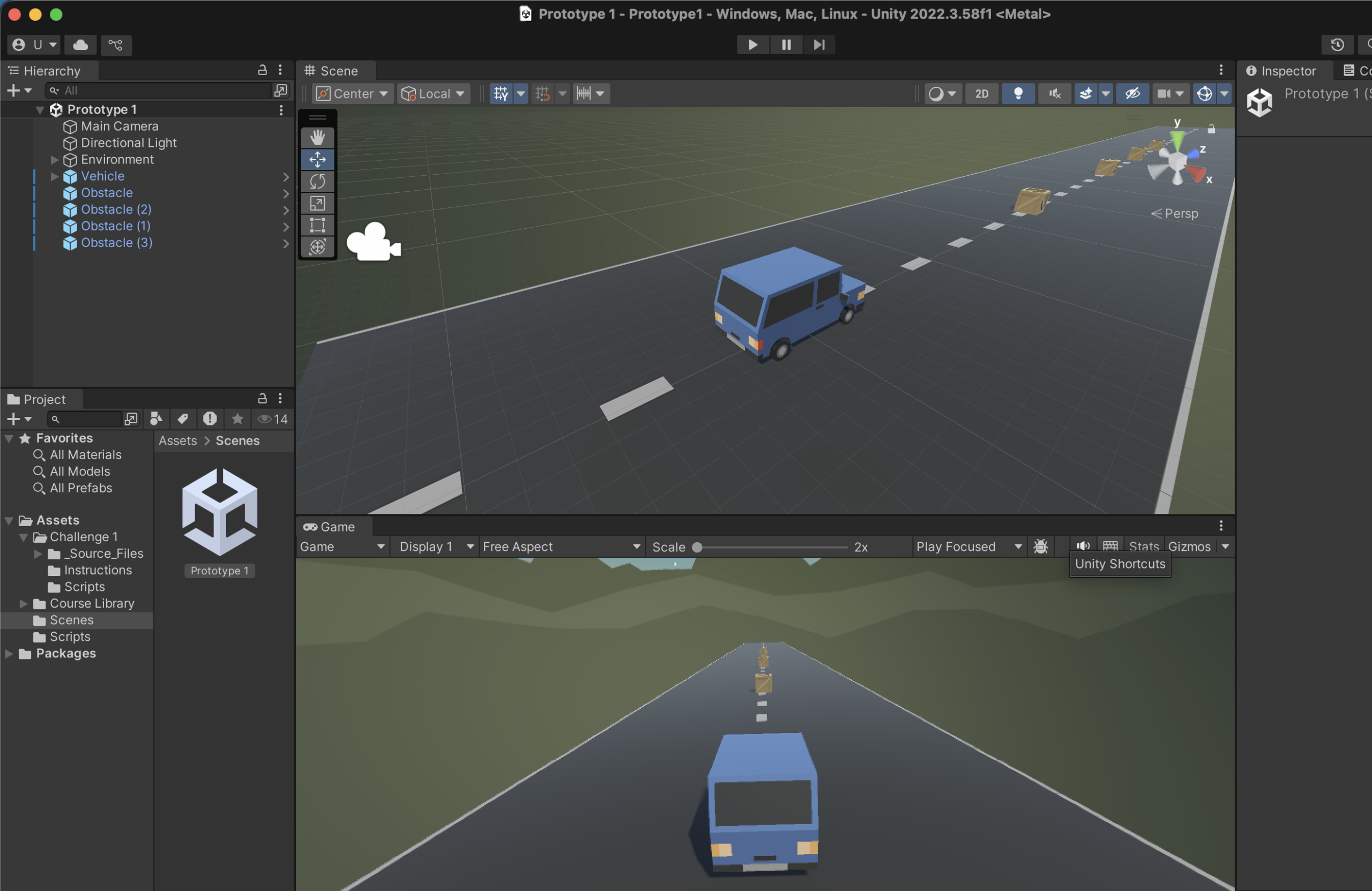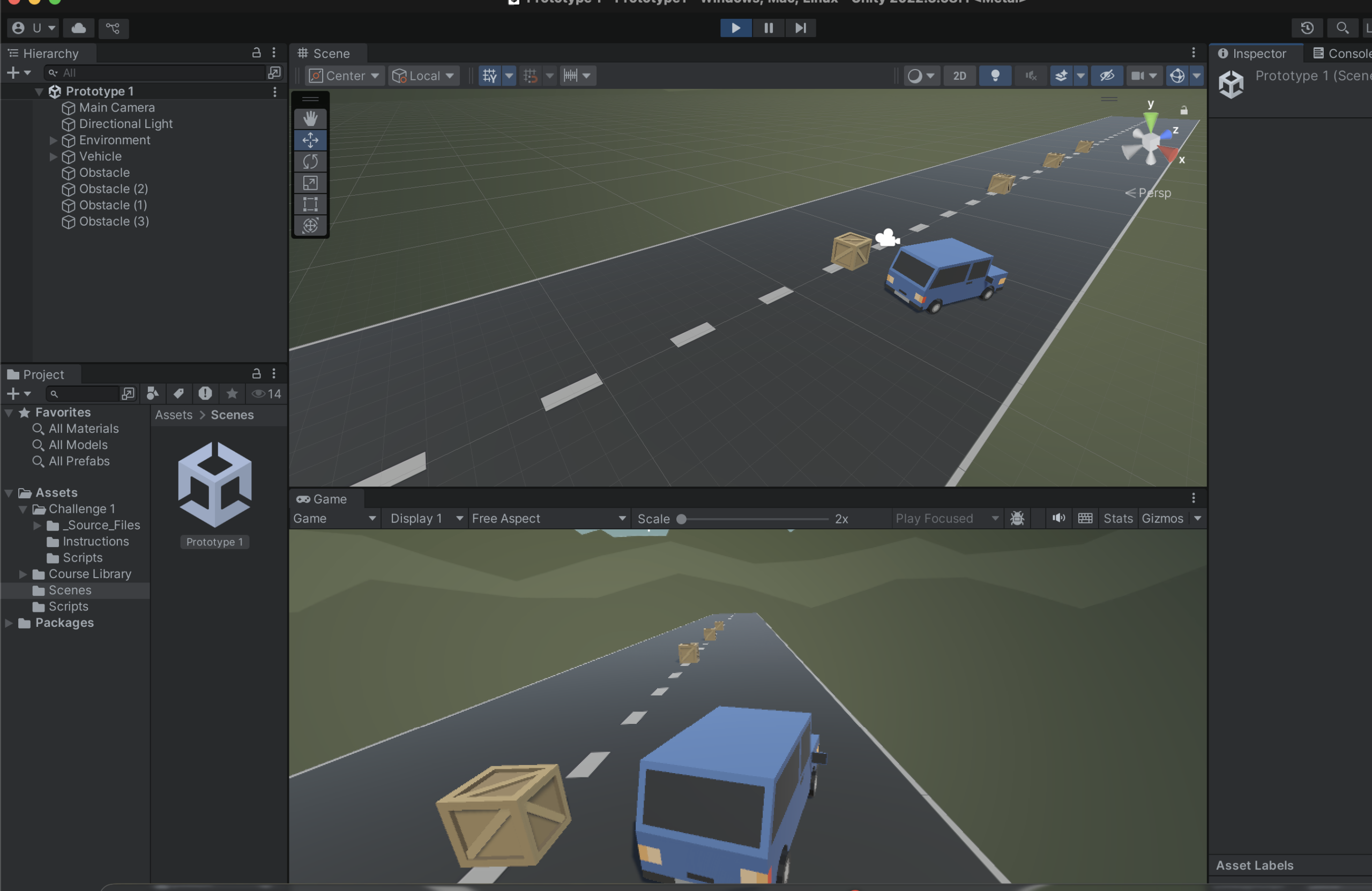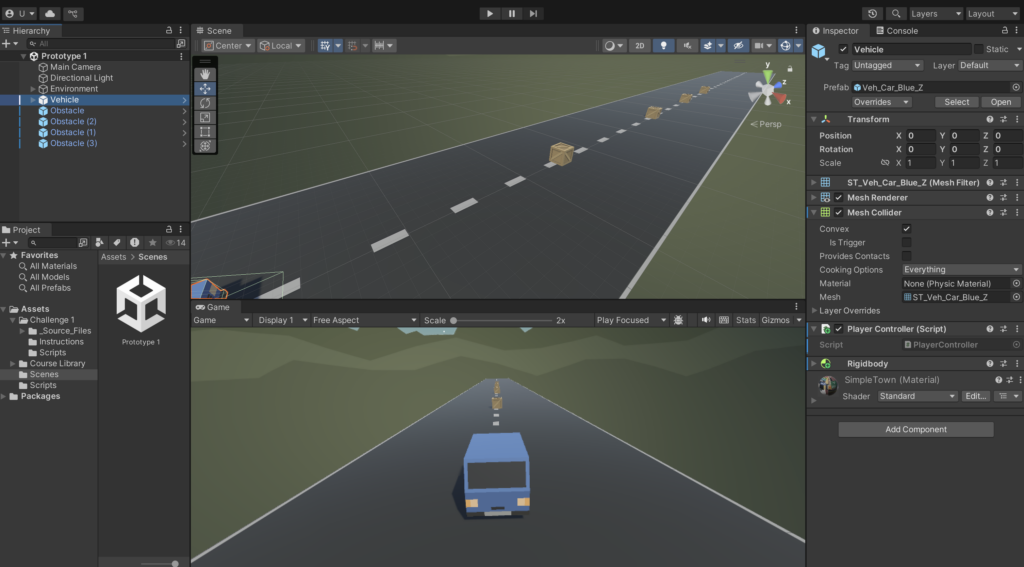 最初のレッスンでは、3D空間に車を配置し、それをプログラムで動かす基礎を学びました。