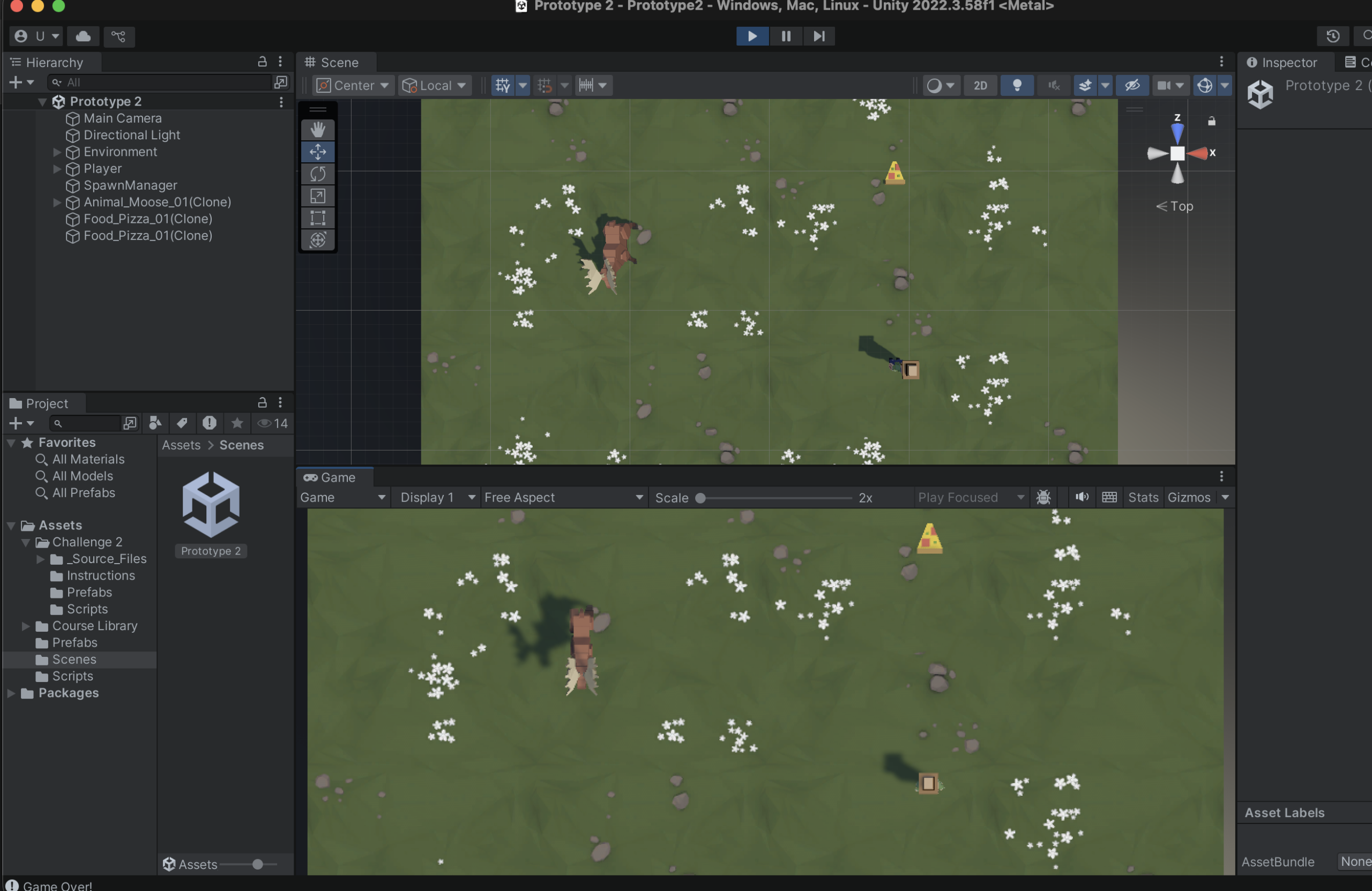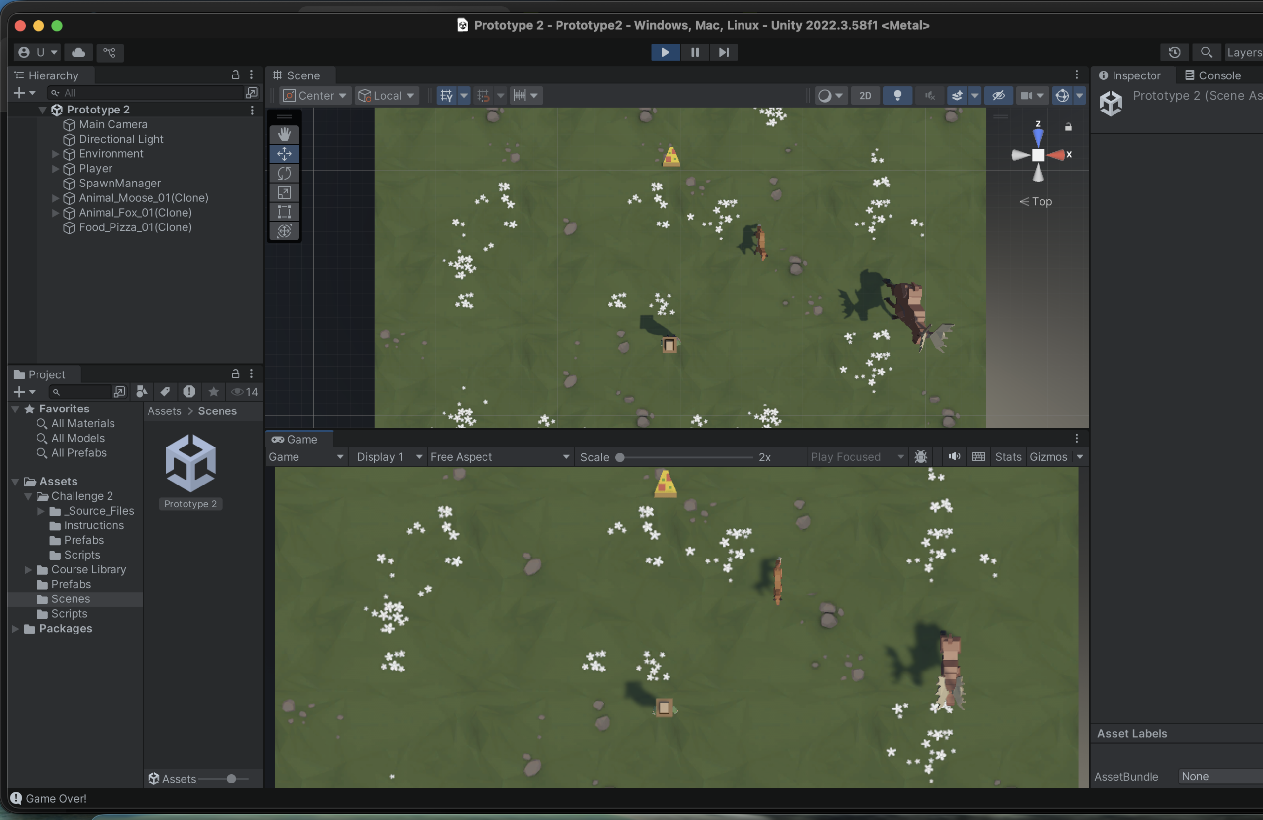 - 実践内容: ピザの形をした弾を前方に投げて、向かってくる動物たちに当てて消去するプログラム。